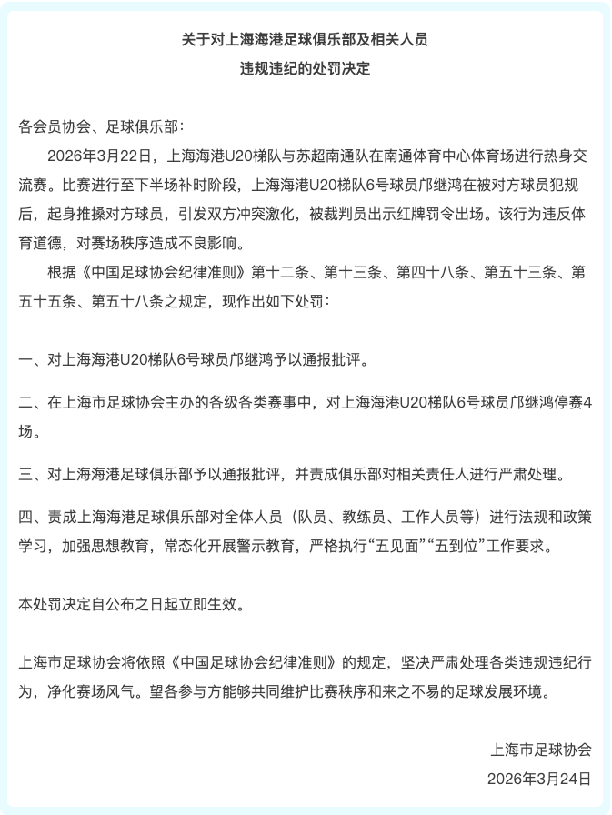 3月24日,针对3月22日南通队取上海海港青训梯队友情赛中呈现的多起行为做出庄重处置,上海海港U20梯队6号球员邝继鸿正在被对方球员犯规后,上海市脚球协会发布关于对上海海港脚球俱乐部及相关人员违规违纪的惩罚决定。起身推搡对方球员,对邝继鸿予以传递;上海海港U20梯队取苏超南通队正在南通体育核心体育场进行热身交换赛。4名南通队球员被处以3至8场不等的停赛,角逐进行至下半场补时阶段,同日,对邝继鸿停赛4场。被评判员出示红牌罚令出场。正在上海市脚协从办的各级各类赛事中,